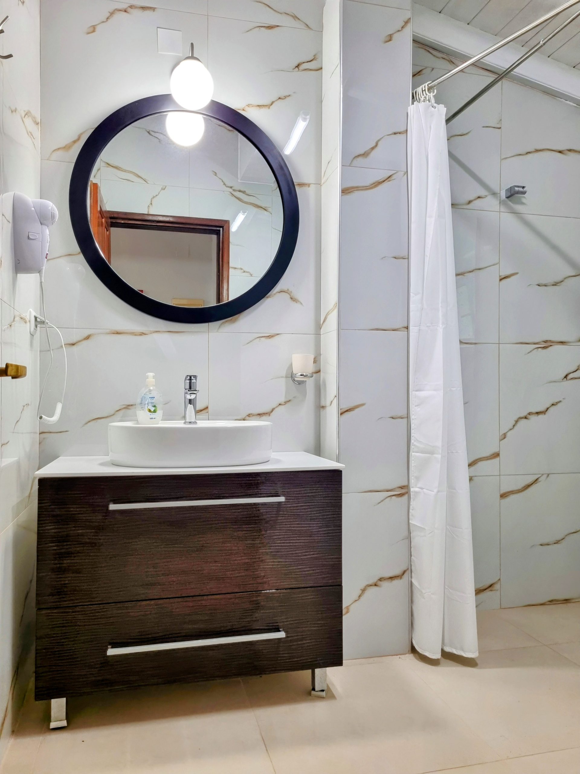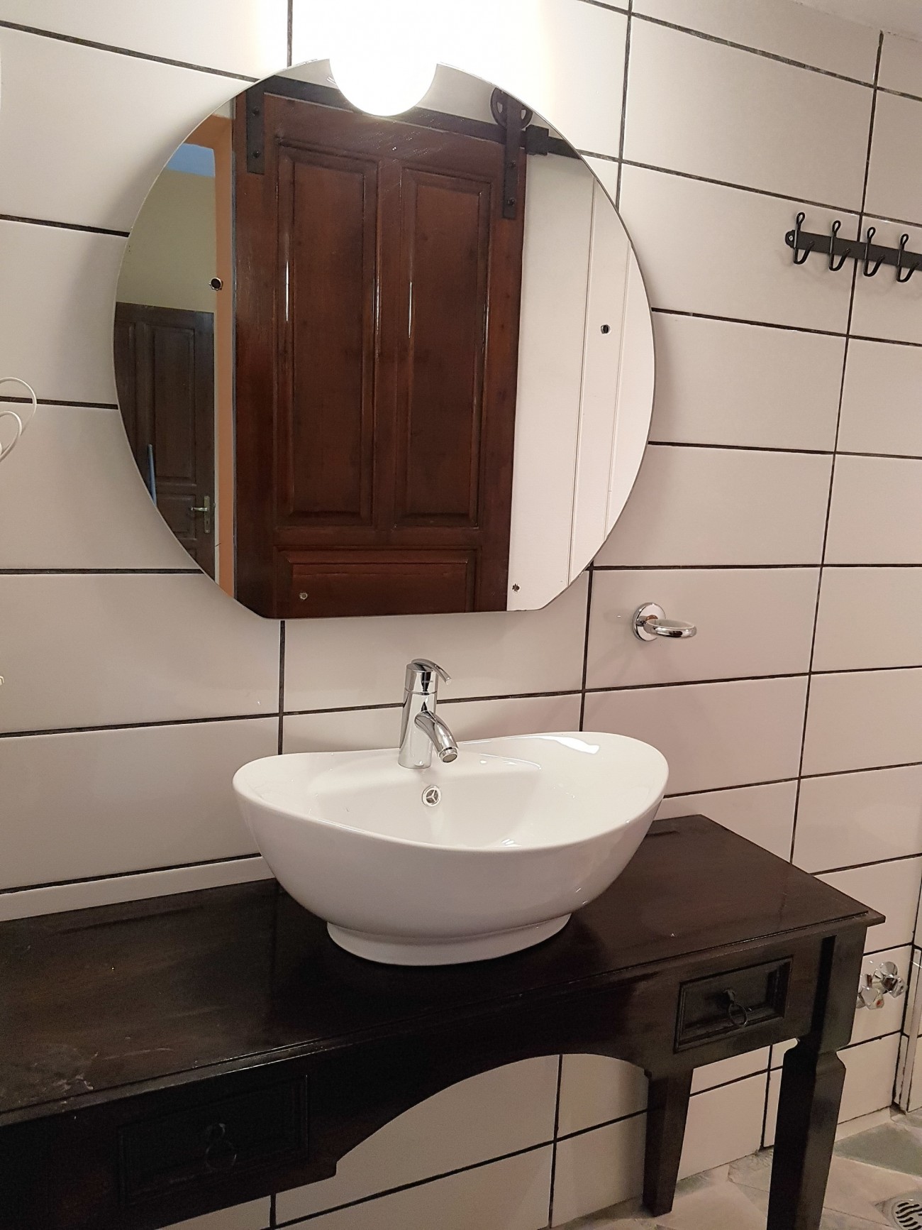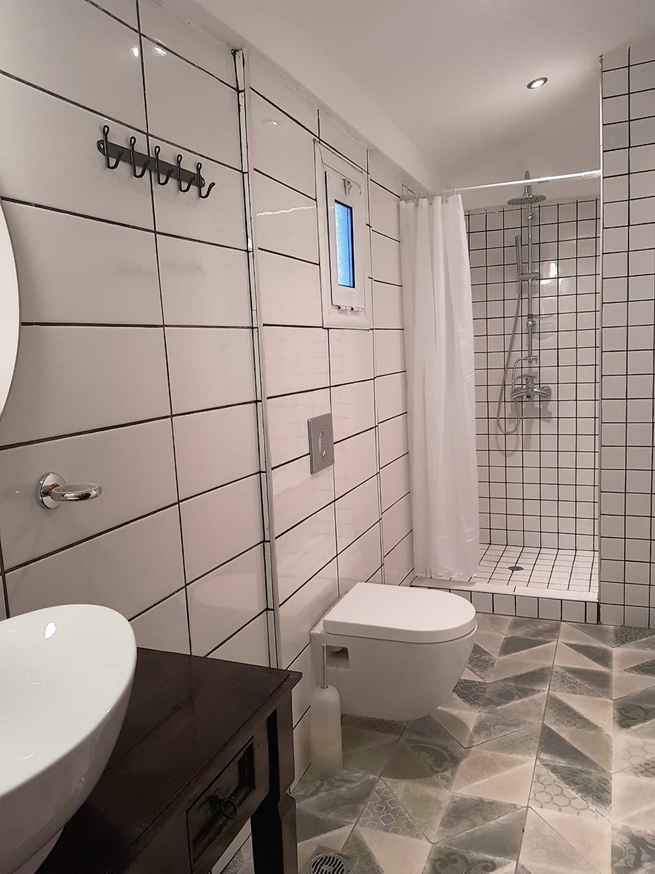“Deluxe Family Suite” disposes of 2 spacious bedrooms, which are totally bright and warm. The master bedroom (one double bed and one single-bed) has been decorated with antique furniture, while a French door opens the way for the sitting area in the balcony. The sunlight comes through and embraces you during the day. The second bedroom possesses also one double-bed, large wardrobe, large window which allows the daylight / sunlight in the room. There is also the entrance of the en-suite -second- bathroom of the apartment, which is decorated in retro style with black and details, with shower, as well as all the essentials . Modern decoration and orange shades make the perfect atmosphere for a relaxing sleeping.