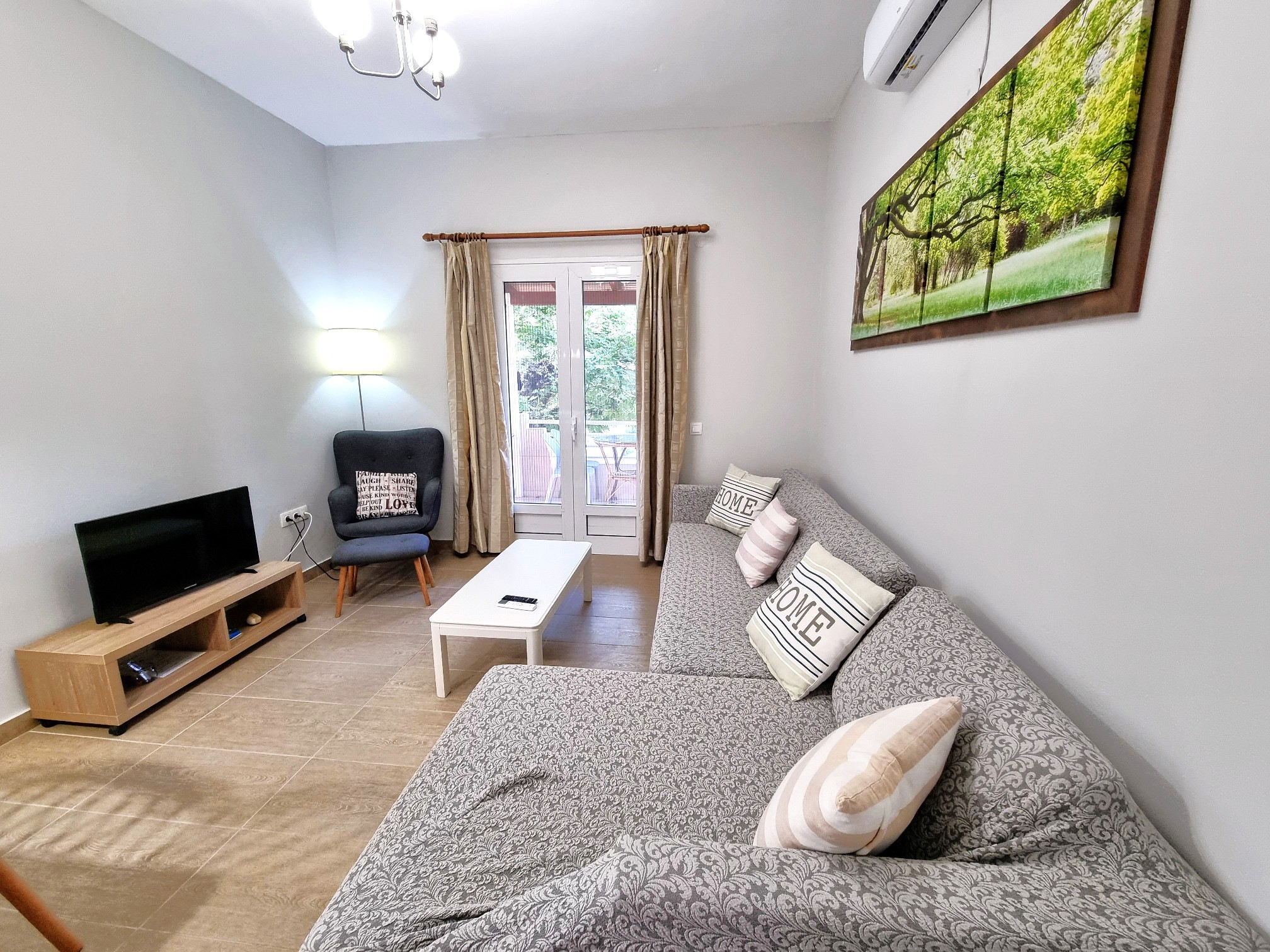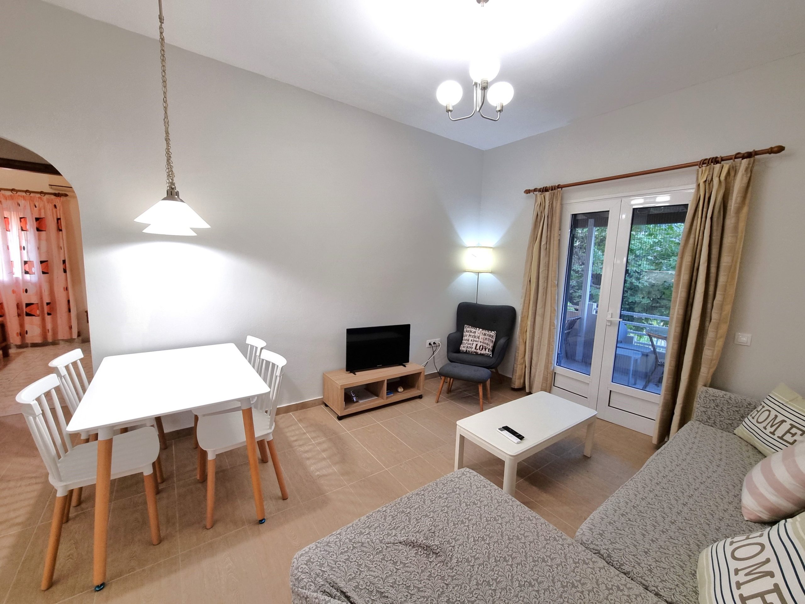 Indoors, the house will welcome you into a friendly and familiar atmosphere. The bright living room possesses one large corner sofa-bed and a comfy armchair. The modern colours of the furniture complement to a better geniality, while this is being complemented by the latest technologies such as a flat screen. A modern decoration surpasses the ordinary styling of a house, whereas it is combined with comfort and amenities. A French door in the middle of the living room will lead you to a spacious balcony with views towards mountain Pantokrator and beautiful surroundings.