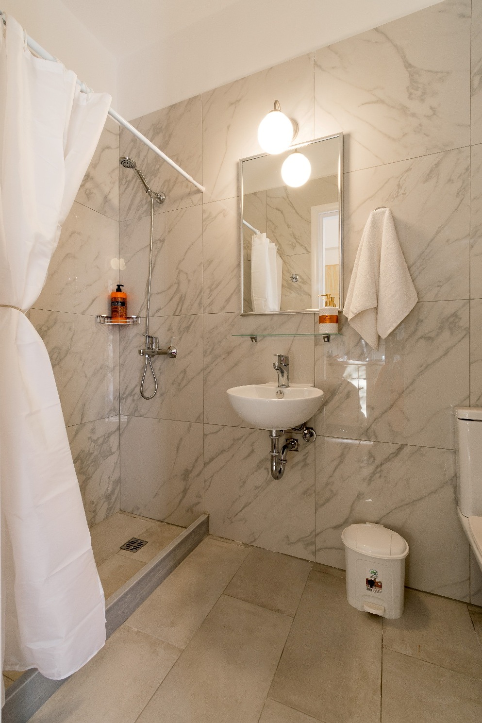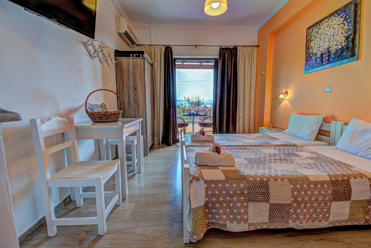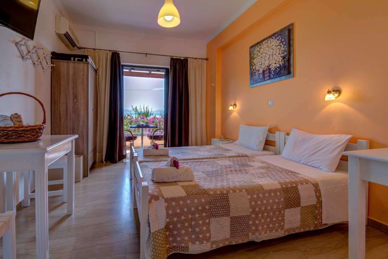 “Deluxe Studio” - Marilena Apts & Studios is an ideal option for couples and small group of friends. Deluxe Studio consists of 2 joined single-beds, forming a queen size bed. Modern studio with bright colours and minimalistic furniture. Spacious and bright, since a wide French door welcomes the daily sunlight. Its orange colours combined with bright, white furniture add up to the creation of a reposing atmosphere, which at any chance coincide with summer modes. Please note that a 3rd bed (foldable) can be added on request, in order to accommodate one extra person.