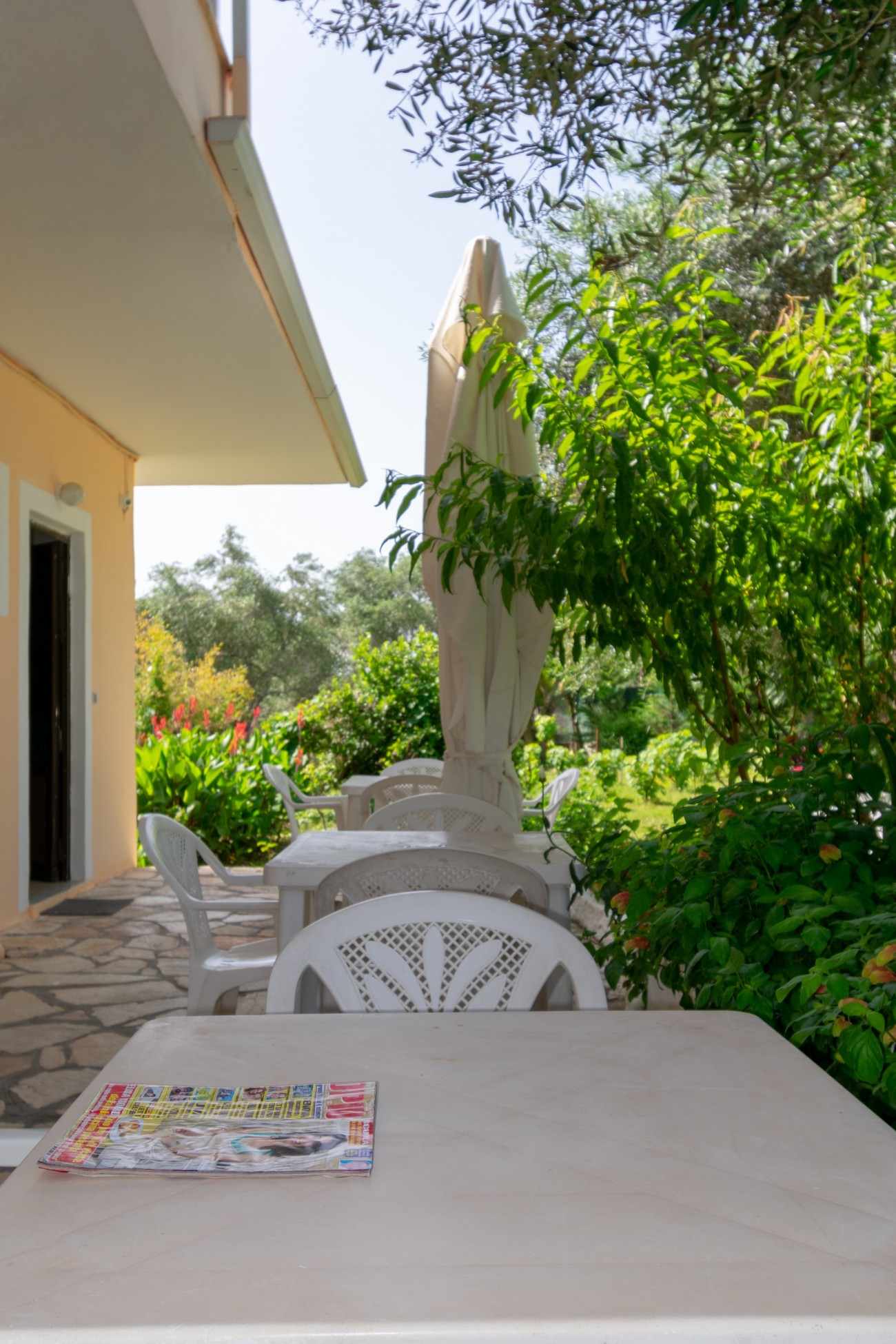 Balcony with sitting-dining area, with majestic views towards the sea the mountain and the lavishly green garden. Spacious bedroom, as well as a dining area combined with a kitchenette. Self-catering accommodation, fully supplied with kitchenware such as utensils, dishes, glasses, even casseroles and pots. Guests can prepare their meals into the cooking rings, while a refrigerator will keep their drinks refreshing.